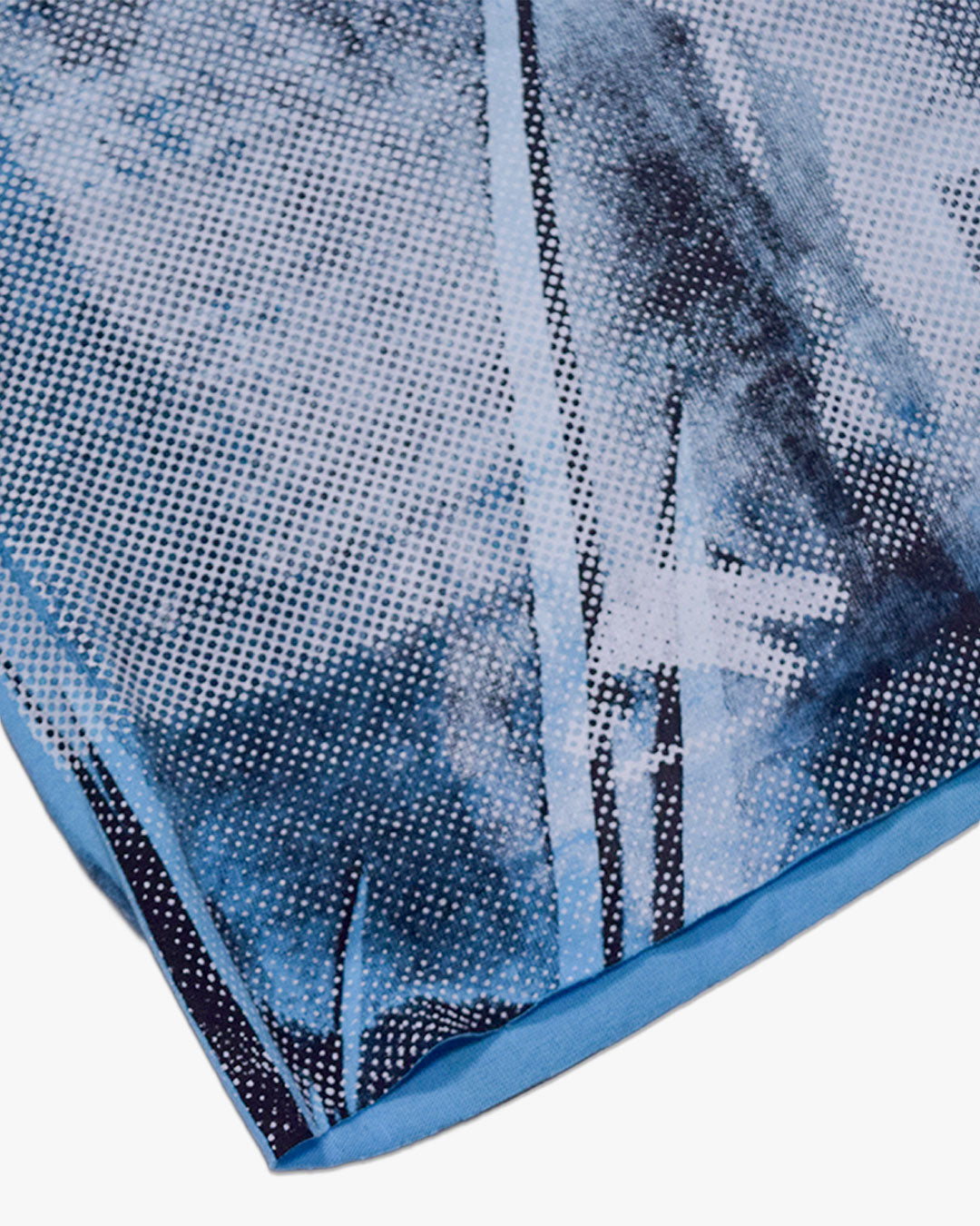 淡いブルーのボディに白インクで下地を作り、その上から黒とグレーの階調でスカートモチーフを構築。